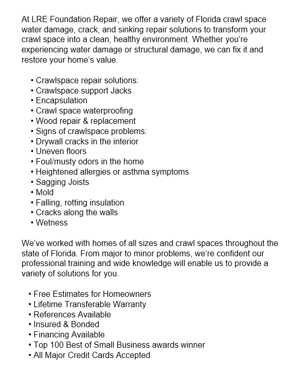 Oviedo Crawl Space Repair is the pioneer crawl space repair company in Florida. We are a family owned establishment so you will get top quality service every time. We are dedicated to providing high-quality crawl space repair services, including crawl space encapsulation and crawl space mold, flood and crack repair. We are so sure of our work that we provide a lifetime transferable warranty.